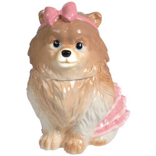 Westland Giftware Kookie Jars Pomeranian Cookie Jar, 10-1/2-inch. This adorable jar features a Pomeranian adorned in pink.